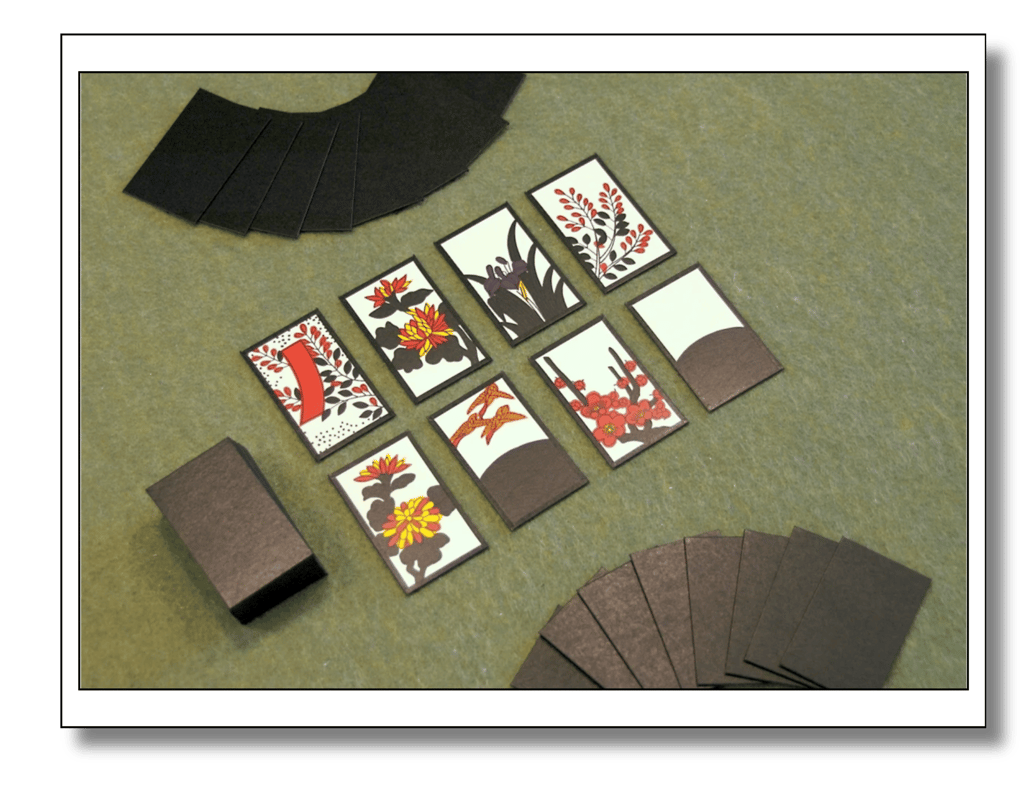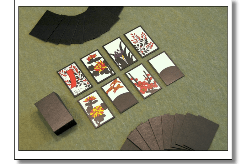 As cartas Hanafuda são pequenas, grossas e decorativas, com belíssimos desenhos de flores e paisagens, sem números ou palavras escritas.