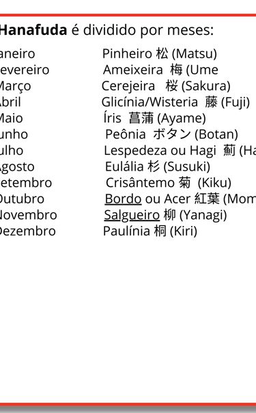 O baralho Hanafuda tem 48 cartas , divididas em 12 conjuntos, cada conjunto representando um dos 12 meses do ano. Cada mês possui ilustrações temáticas de flores ou plantas que simbolizam a estação correspondente no Japão.