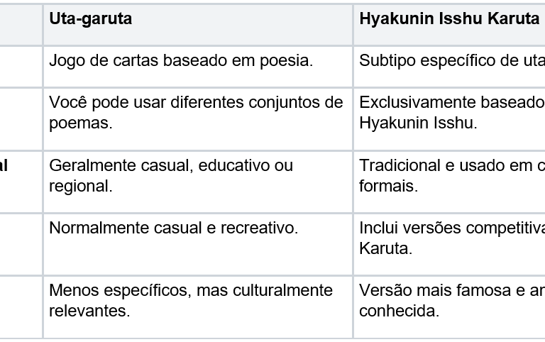 Enquanto Hanafuda é mais associado a jogos de lazer e estratégia visual, como Koi-Koi, Karuta é educativo e cultural, com foco na leitura de poemas ou textos, especialmente para aprendizado ou transmissão cultural. Ambos, porém, conectam uma conexão com a rica história e cultura japonesa.